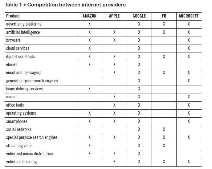 If we consider the leading high-tech companies of today, we see strong competition. As the table shows, they are all competing in several different sectors. This competition is the reason why we can see such rapid innovation and such low costs in the technology industries.