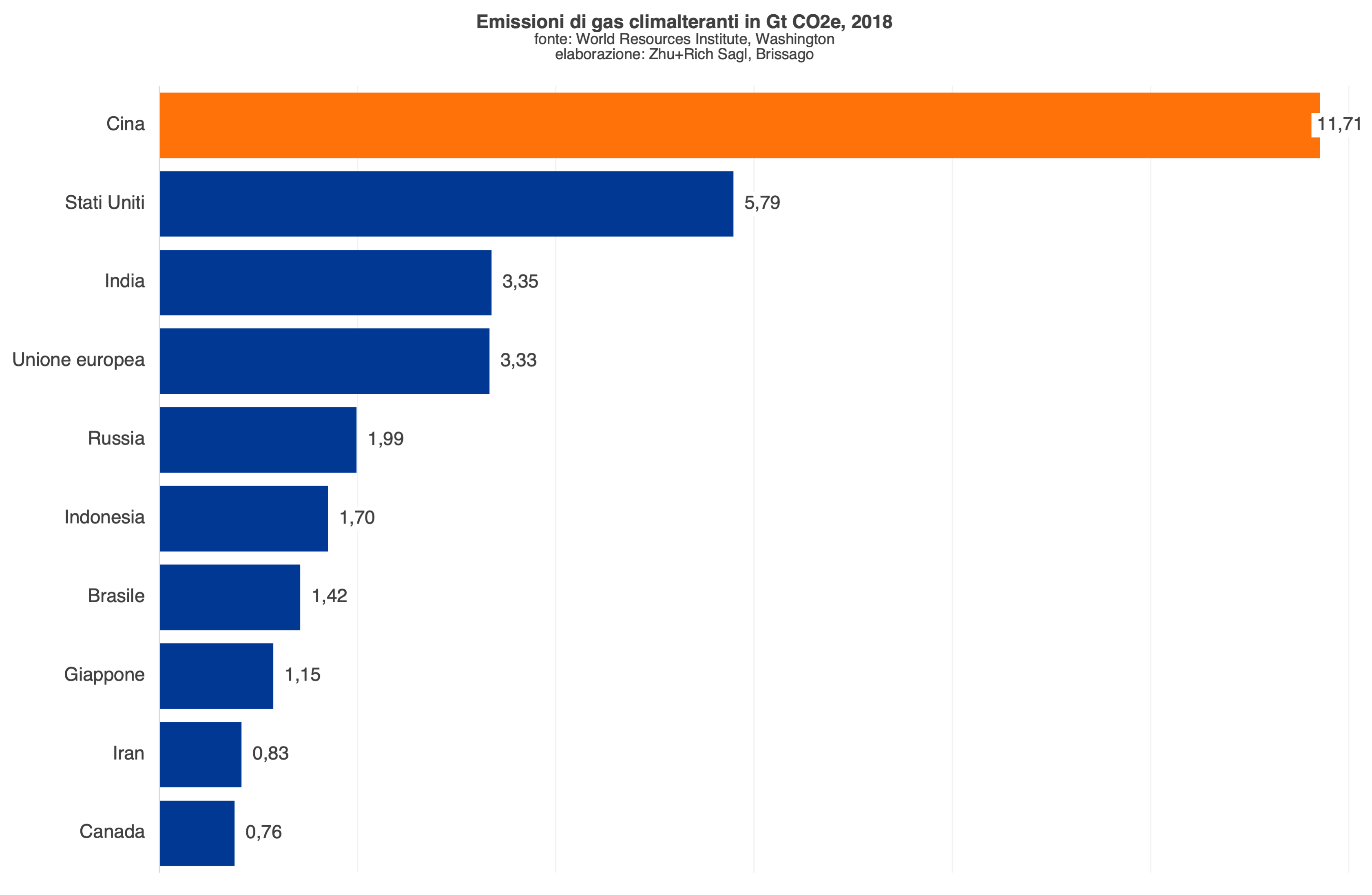 Secondo il World Resources Institute, un’organizzazione no-profit di ricerca mondiale fondata nel 1982 a Washington per volere dell’avvocato ambientalista James Gustave Speth, ai dati attuali, la Repubblica Popolare Cinese immette nell’atmosfera il 24% delle emissioni globali di gas climalteranti, mentre l’Unione Europea meno del 7% su un totale di 48,93 miliardi di tonnellate equivalenti di anidride carbonica (Gt CO2e),[5] un rapporto squilibrato rispetto alle rispettive quote di prodotto interno lordo mondiale che sono pressoché uguali.[6]