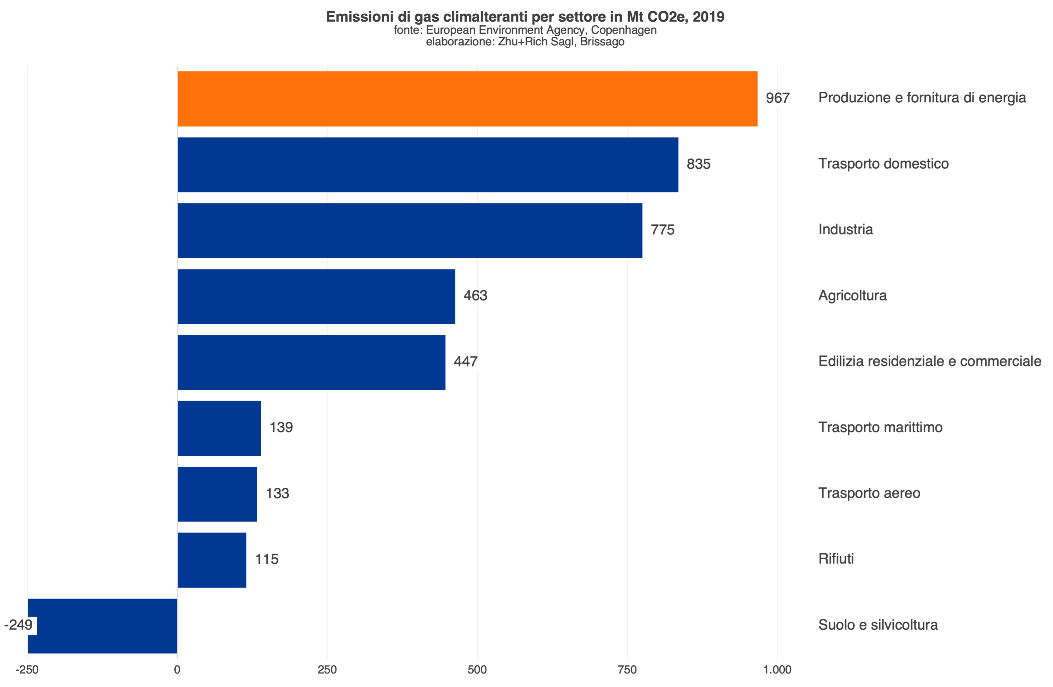 L’Agenzia europea dell’ambiente (AEA) riporta che più di un quarto delle emissioni di gas serra nell’UE è generato dalla produzione e distribuzione di energia su un totale di 3,625 miliardi di tonnellate equivalenti di anidride carbonica. Ma la porzione diventa di tre quarti del totale quando si aggiungono le emissioni generate dal consumo della stessa energia prodotta e fornita. Il processo di decarbonizzazione del settore energetico è dunque un elemento centrale della transizione verde.[9]