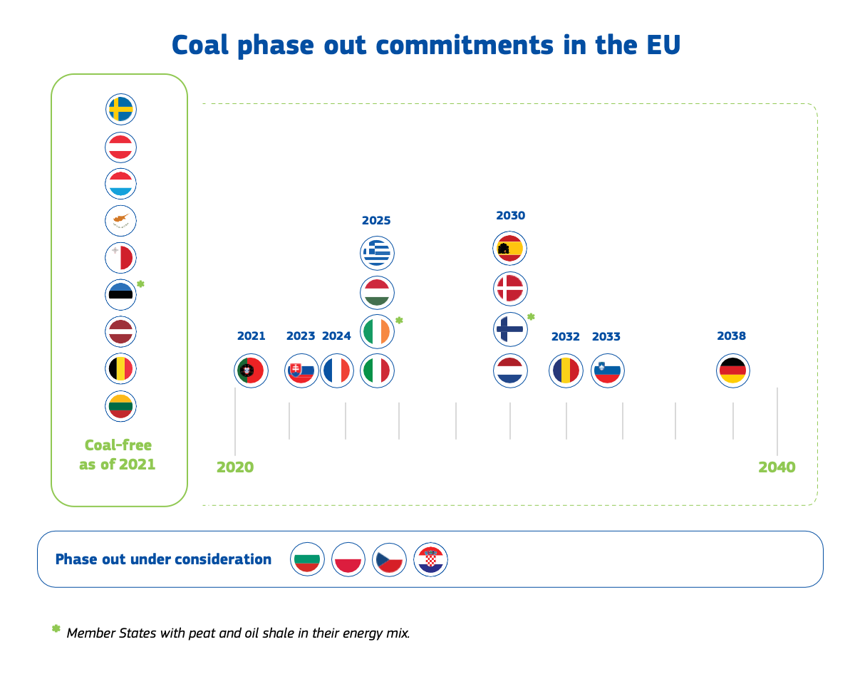 Complementare allo sviluppo delle energie rinnovabili è la chiusura degli impianti per la produzione di energia elettrica alimentati con carbone che rappresentano nell’Unione Europea circa il 13% della produzione totale di elettricità.[10]