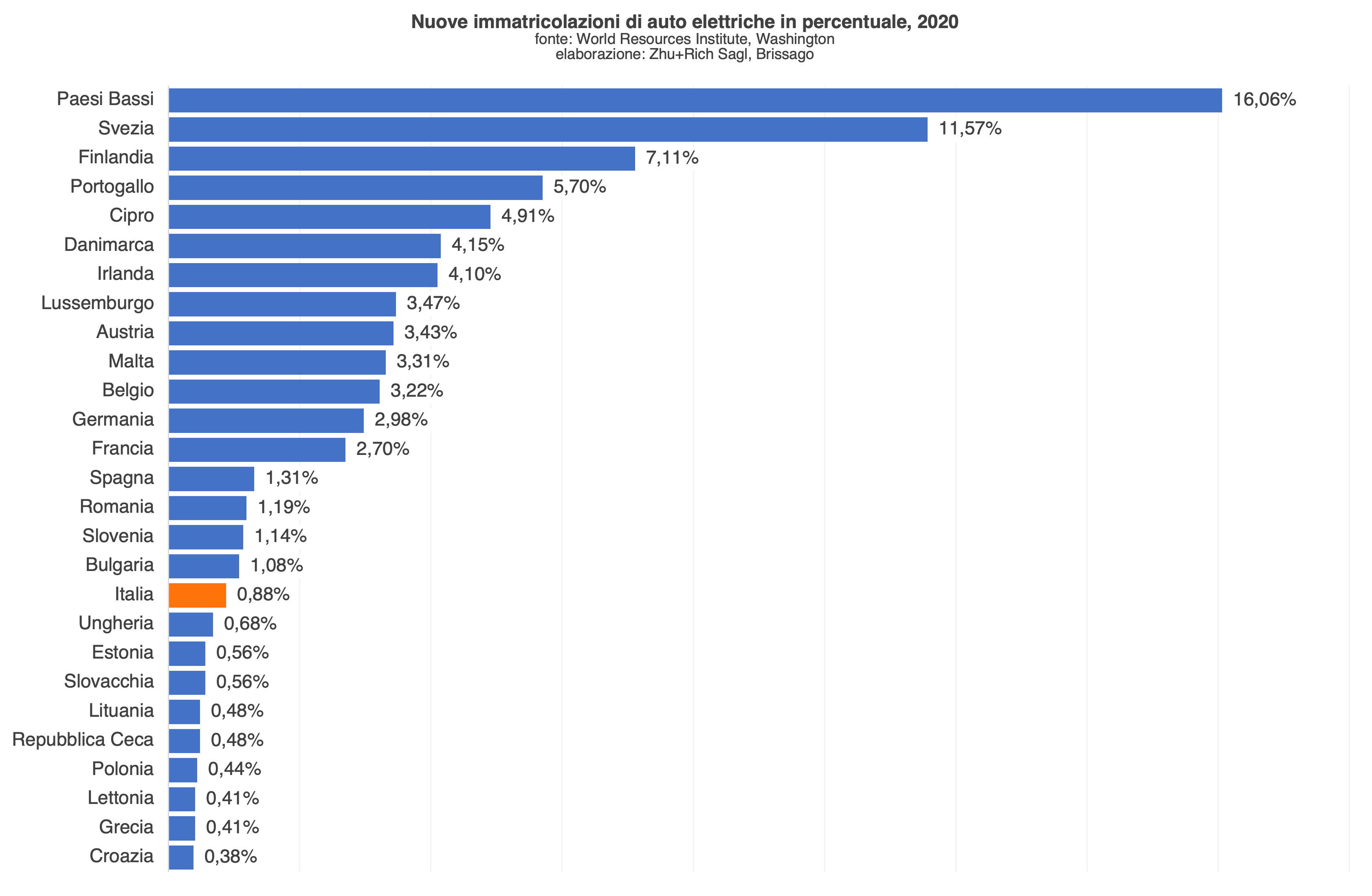 La diffusione dei veicoli elettrici in Europa è in aumento, in linea con l’obiettivo politico di ridurre le emissioni di gas serra dei trasporti, tuttavia, la penetrazione del mercato rimane relativamente bassa, considerando, infatti, i tre paesi più grandi, Germania, Francia, Italia, nei primi due le nuove immatricolazioni di veicoli elettrici nel 2020 non superano il 3%, mentre nel terzo non supera l’uno. Tra i migliori si fanno notare i Paesi Bassi, con il 16% di nuove immatricolazioni.[15]