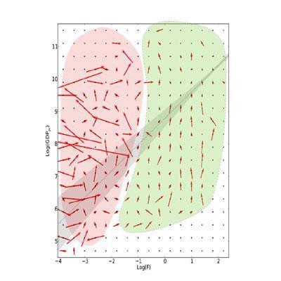 Nel piano Fitness-PIL (“F-GDP per capita” nella figura) si notano dunque due macro-aree. Da una parte una zona non caotica (anche detta laminare) dove giacciono le traiettorie corrispondenti alle nazioni che si evolvono in modo lineare e dunque prevedibile (dal basso verso l’alto) nel senso del metodo degli analoghi: questa è una zona di bassissima caoticità. Questa prevedibilità è il segno che la Fitness è il fattore rilevante che ne ha determinato la crescita. Nella zona caotica (a sinistra) invece giacciono traiettorie molto intricate – segno che l’evoluzione economica dei Paesi che rappresentano è incoerente e pertanto imprevedibile come lo è un sistema molto caotico. In questo caso la loro evoluzione economica non è guidata dalla variabile Fitness, ma da fattori esogeni e difficilmente misurabili, come ad esempio la mancanza di una politica industriale, guerre civili, disastri naturali, o eccessiva dipendenza dall’esportazione di materie prime. Questa enorme differenza tra nazioni evidenzia come l’evoluzione delle economie dia luogo a un sistema molto eterogeneo, anche quando le condizioni iniziali, in termini di PIL, sono identiche.