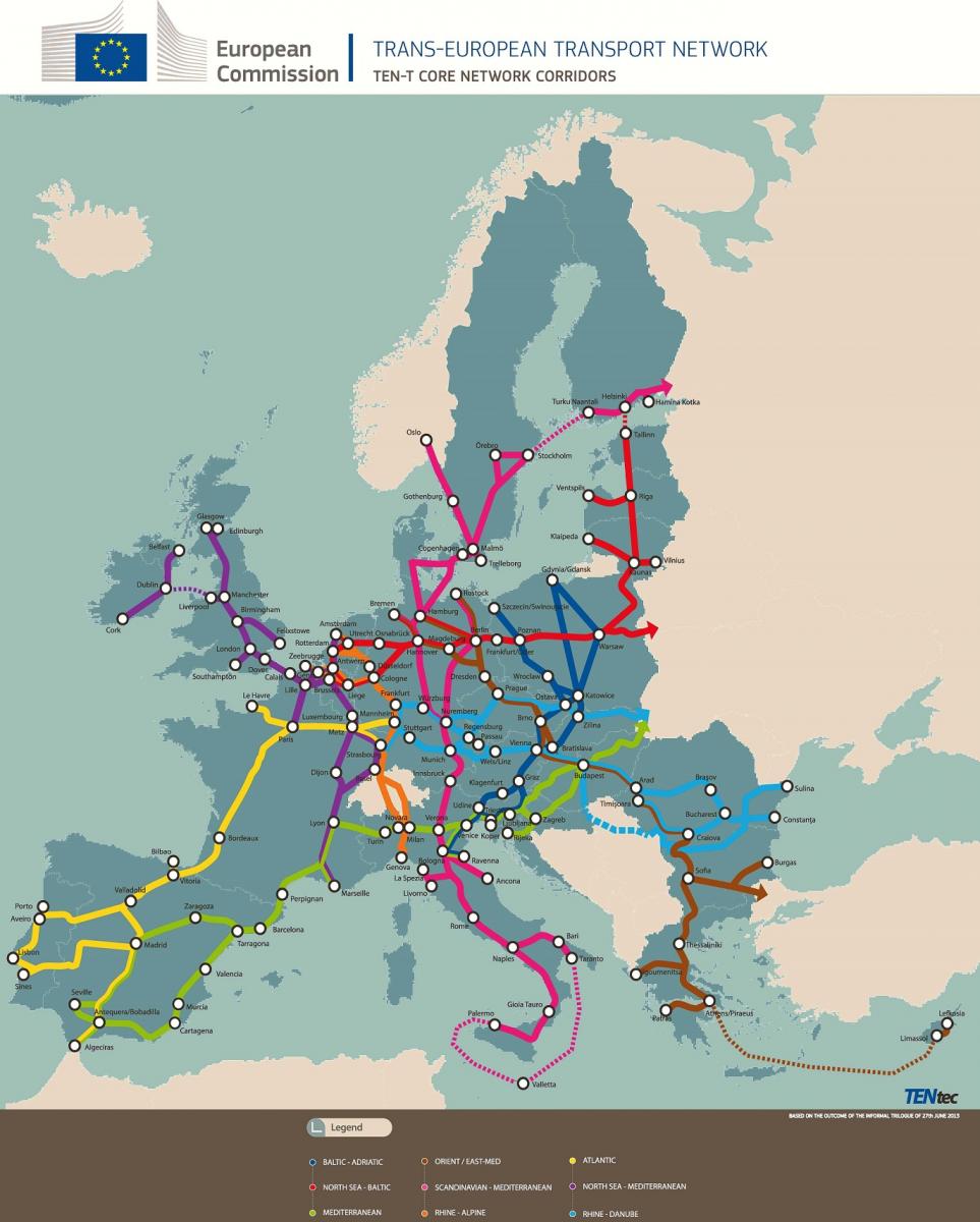Le infrastrutture europee sono tuttora gestite da una miriade di enti con regole, usi e interessi differenti: gli utenti di strade o ferrovie sanno bene di doversi adattare, nel giro di pochi chilometri, a modalità di utilizzo e pagamento completamente differenti – come quelle autostradali tra Italia, Austria e Germania, o quelle ferroviarie tra il quadruplo binario tedesco e il binario unico ceco, o lo scartamento diverso tra Francia e Spagna. I progetti di Bruxelles, ridotti infine da trenta a nove grandi assi di trasporto multimodali (Trans European Transport Networks, stradali, ferroviari, marittimi), più uno esclusivamente dedicato allo sfruttamento delle rotte marittime, sono dunque mirati a ridurre le inefficienze di collegamento tra i poli dell’economia e della logistica continentale – considerando il traffico di passeggeri servito in maniera abbastanza soddisfacente dalle rotte aeree.