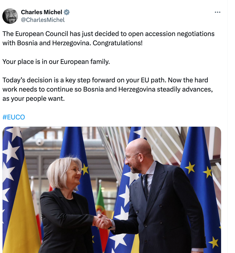 In early March of this year, the European Council made the decision to commence accession negotiations with Bosnia and Herzegovina, which has been a candidate for EU accession since 2022. On this occasion, the President of the European Council, Charles Michel, wrote on X platform that Bosnia belongs to the European family. When asked about the realistic possibility of Bosnia and Herzegovina and other Western Balkan countries joining the EU by 2030, Ćerimagić suggests that with political, technical and financial support, all candidates could implement the necessary reforms and fulfill the required conditions within the next six years.