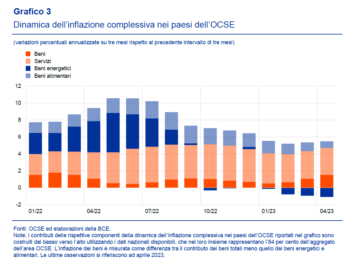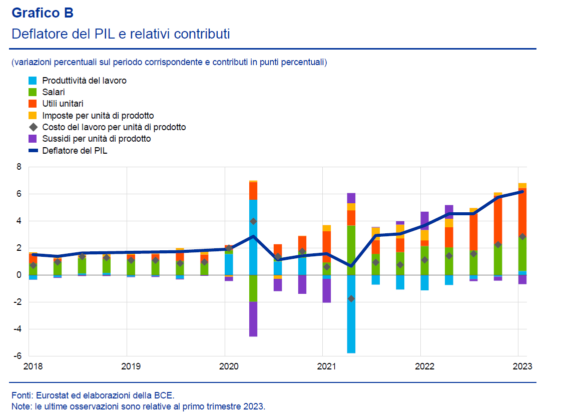 La questione non è da poco. La BCE osserva infatti che “le spinte salariali, che in parte riflettono pagamenti una tantum, diventano una fonte di inflazione sempre più rilevante”. I redditi per occupato sono aumentati del 5,2% nel primo trimestre del 2023 e le retribuzioni contrattuali del 4,3%. Mentre “gli effetti indiretti dei passati shock ai prezzi dell’energia e le altre pressioni inflazionistiche vengono gradualmente meno, il costo del lavoro diventerà il fattore principale alla base dell’inflazione misurata sull’IAPC al netto di energia e alimentari” (IAPC sta per “indice armonizzato dei prezzi al consumo”).
