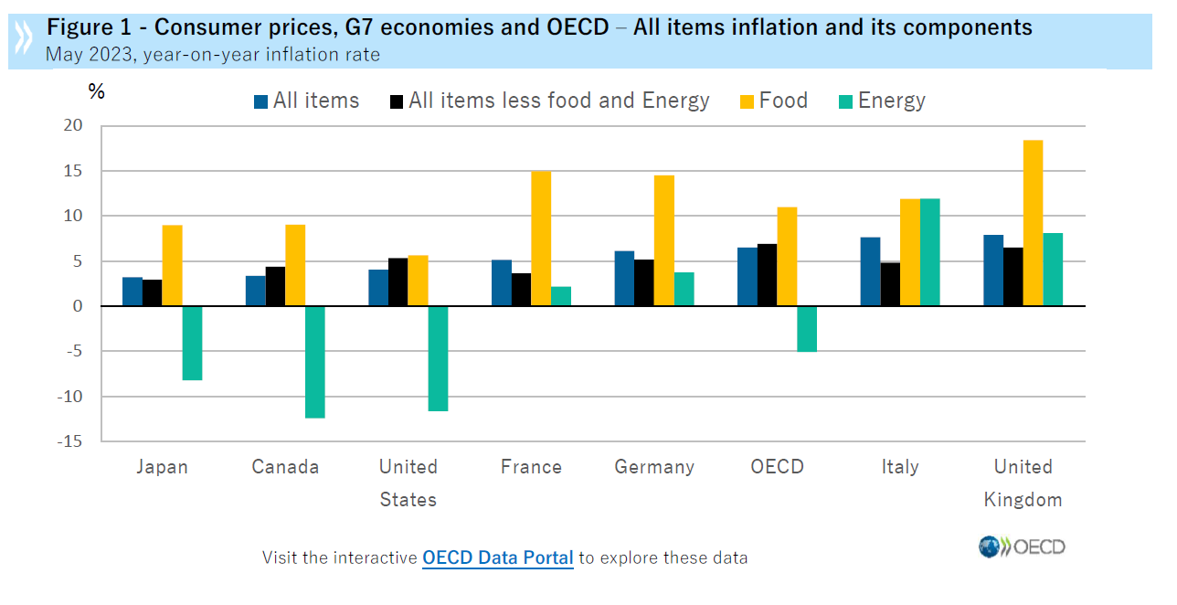 Ma questi dati, che sono riferiti all’Eurozona, nascondono profonde differenze fra i singoli Paesi. Se guardiamo alle rilevazioni diffuse da OCSE ai primi di luglio osserviamo due cose. La prima, che conferma l’analisi della BCE, è che il calo dell’inflazione core (senza energia e alimenti freschi) è molto più lento di quello dell’inflazione complessiva, pure se nell’insieme i prezzi nell’area si stanno raffreddando (il CPI, consumer price index, è diminuito dal 7,4% di aprile al 6,5 di maggio).