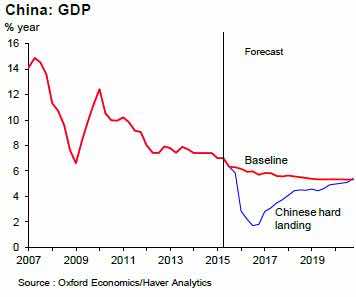 Oxford Economics has used its Global Economic Model to evaluate the impact on the global economy of a significant reduction in the growth rate of the Chinese economy, with investment spending decelerating sharply over the course of this year and next. In this scenario, government investment would drop nearly 4% below baseline, as local government scales back new projects. Private investment is also scaled back, and a loss of confidence in the prospects for the economy dampens FDI inflows to 40% below baseline by 2016. The Chinese authorities would respond with a range of actions, made possible by its low fiscal deficit and the large amount of foreign reserves in its possession. The central bank speeds up rate cuts, hitting the zero lower bound by the end of 2016, and allows the currency to weaken substantially. Growth in China slows sharply, declining to 2% in 2016 as investment contracts, and only returns to 5% by 2019. By the end of the decade, GDP is nearly 8% below baseline.
