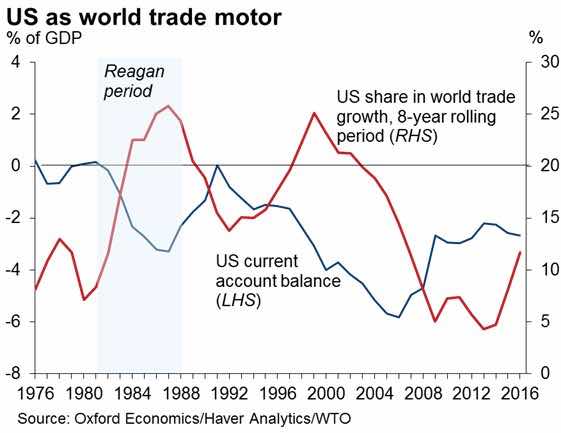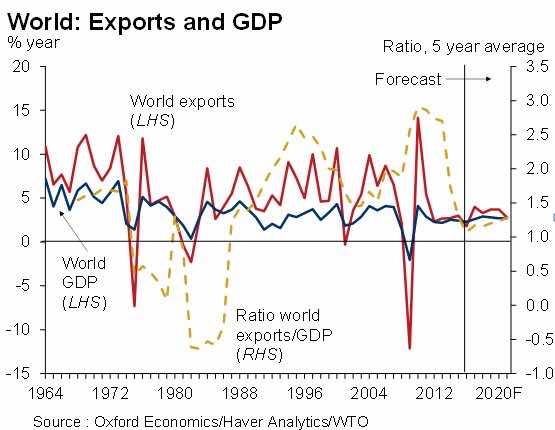 Uno dei fattori strutturali dietro al ridotto dinamismo della crescita globale è la ormai acclarata tendenza alla riduzione del ruolo di motore dell’economia mondiale sostenuto negli ultimi decenni dalla crescita degli scambi commerciali. Nella sua semplicità, il grafico 1 mostra due aspetti: come siano diminuiti i tassi di crescita dell’economia e del commercio mondiale; come la riduzione dei tassi di crescita delle esportazioni mondiali sia dovuta anche al più basso moltiplicatore del commercio rispetto al PIL stesso (linea tratteggiata gialla). Il risultato è che nel 2016 si è avuta una crescita del commercio globale stimabile intorno all’1,5%, valore che Oxford Economics vede in miglioramento al 2,7% nel 2017, ma comunque molto al di sotto della media di lungo termine del 5%.