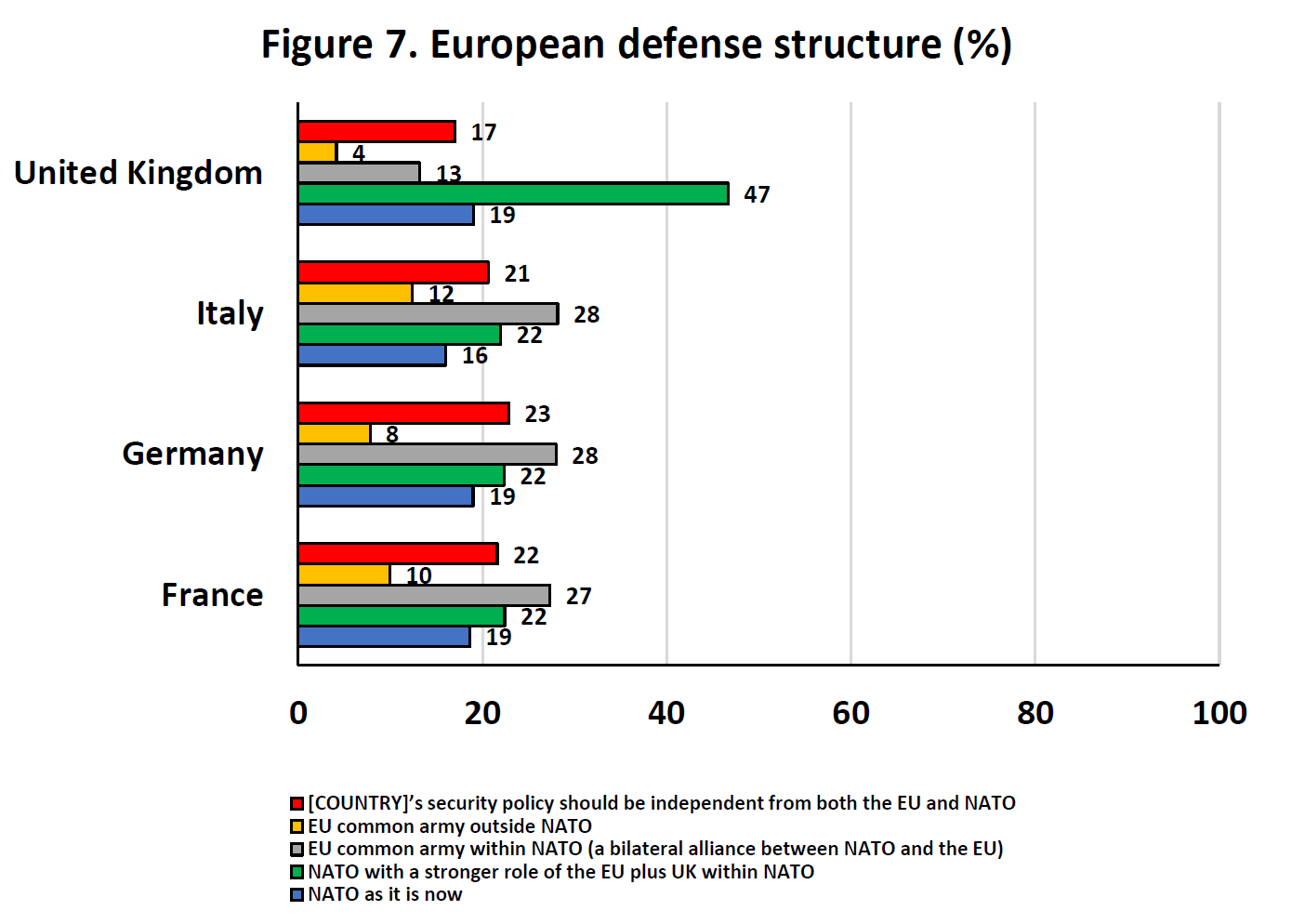 When it comes to the preference for a common defense structure in European countries, the picture among the four countries becomes more complex and nuanced. No more than a tenth of respondents (ranging from 4% in the UK to 12% in Italy) are in favor of a European army fully independent from NATO. Similarly, support for the current NATO structure does not receive substantial support (between 16% and 19%). These percentages are not significantly different from those who wish for a national security policy independent of both NATO and the EU (ranging from 17% in the UK to 23% in Germany). A plurality of respondents in Germany, Italy, and France wish to have an EU common army within NATO. Not surprisingly, in the UK, many respondents would prefer a greater role for the EU and the UK within NATO, without advocating a common European army.