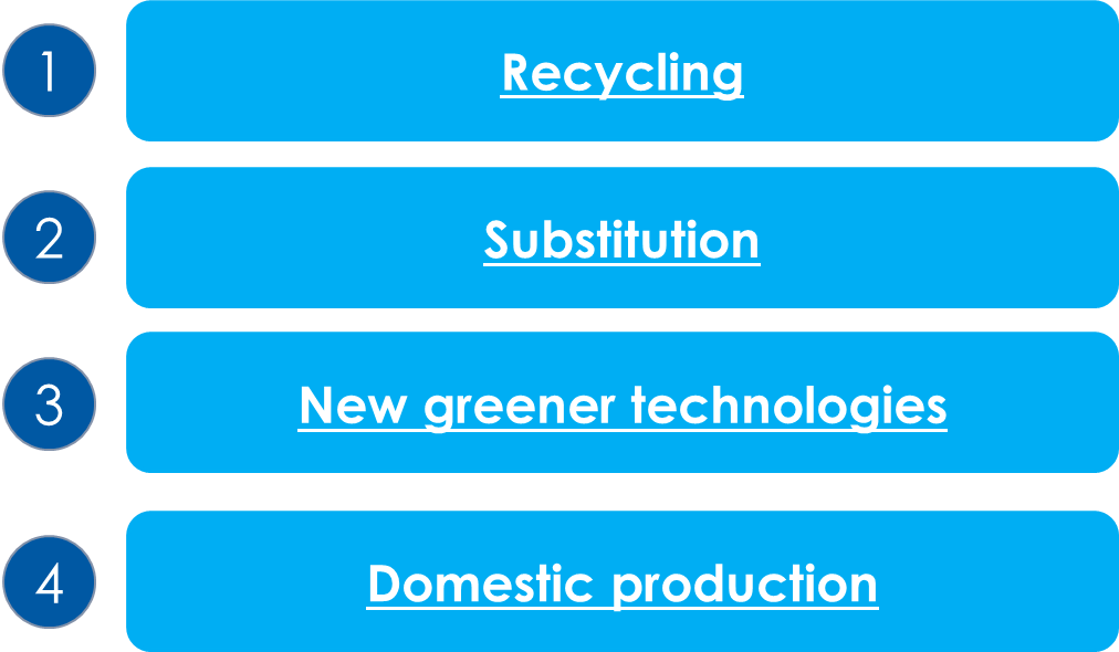 Substitution is a further action to mitigate risks. Some rare earths are used for their permanent magnetic characteristics (for example, neodymium, samarium, dysprosium) in electric traction motors and wind turbine rotors. There are alternative solutions to avoid using such critical materials. In e-mobility, BWM has launched the iX model with a brushed electric motor not requiring permanent magnets. Other car manufactures (Mercedes) are working to adopt batteries with a low percentage of cobalt, though with a higher share of nickel, with the long-term objective of substituting this critical material. Similarly, the use of asynchronous induction generators with cage rotors in the wind generators (for example, Vestas) is an alternative to permanent magnets. The current volatility of raw materials prices is a driver for the industry to adopt technological solutions based on materials more widely available.