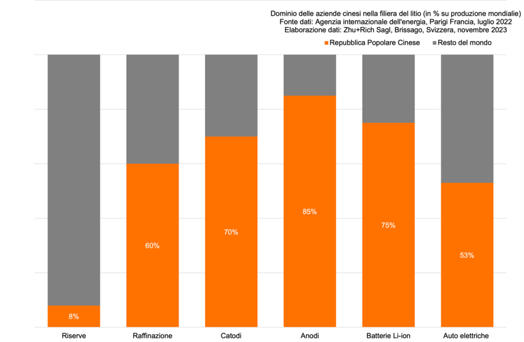 Le aziende cinesi producono anche catodi, polo positivo della batteria, per una quota di circa il 70% del totale mondiale.