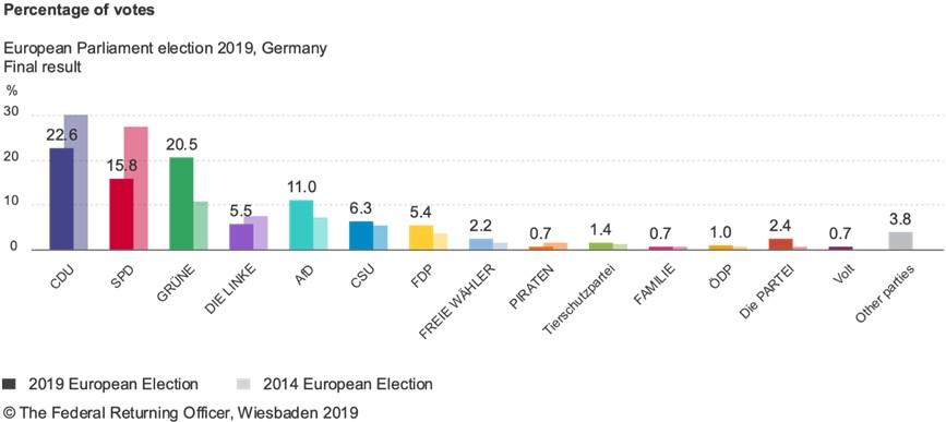 Today, the fight against climate change is clearly at the forefront of public concern in Germany. In May, during the European Parliament election, the results issued by the Federal Returning Officer showed that the Greens supplanted the Social Democrats (SPD) to become the second biggest party after Angela Merkel’s Christian Democrats (CDU/CSU), an extraordinary advance of 10 seats, precisely those that the SPD lost in the same round of voting.