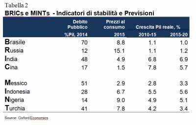 Pur se anch’essi importanti dal punto di vista economico – sono attesi tra i primi venti paesi al mondo entro un decennio – e demografico, il Pil dei MINT nel loro complesso conta oggi per circa un terzo di quello cinese. Questi paesi (Messico, Indonesia, Nigeria, Turchia) sono caratterizzati da situazioni molto differenti tra loro, e fattori politici e/o di dipendenza dall’estero potrebbero rallentarne lo sviluppo in maniera significativa. I rischi politici, legati alle problematiche religiose dell’Islam integralista, sono particolarmente presenti in Nigeria e in Turchia.