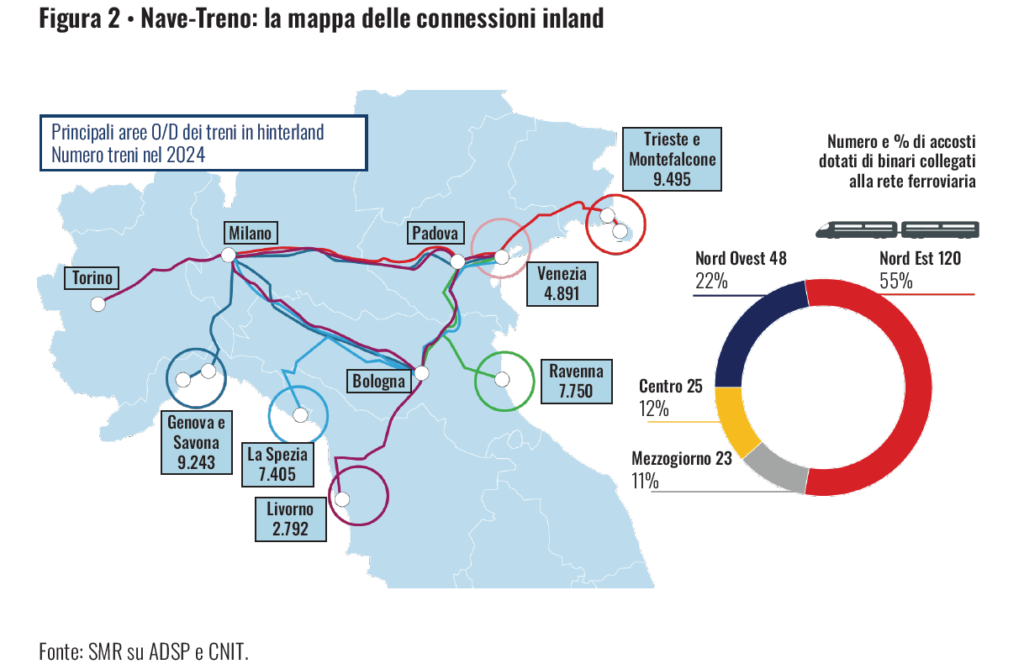I casi italiani mostrano con particolare chiarezza come l’integrazione tra porti e ferrovia possa tradursi in un rafforzamento del posizionamento strategico degli scali e, più in generale, del sistema economico nazionale. Per fare alcuni esempi, il porto di Trieste sull’asse adriatico rappresenta uno degli esempi più avanzati in questo senso. Grazie a una strategia che ha posto la ferrovia al centro del proprio modello di sviluppo, Trieste è riuscito a costruire un profilo distintivo nel panorama mediterraneo ed europeo. Nel 2024 circa il 54% dei container movimentati nello scalo ha utilizzato il trasporto ferroviario, una quota tra le più elevate in Europa. Questo dato non è soltanto un indicatore di efficienza operativa, ma riflette una precisa scelta strategica: utilizzare la ferrovia per ampliare il bacino di mercato del porto e inserirlo stabilmente nelle catene logistiche dell’Europa centrorientale.