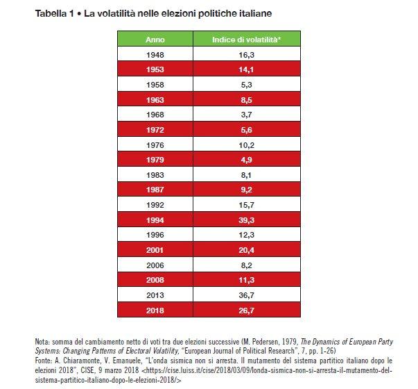 L’“indice di volatilità”, un parametro che misura il cambiamento delle preferenze elettorali fra un’elezione e l’altra, testimonia che le ultime due elezioni politiche italiane – 2013 e 2018 – hanno fatto registrare due fra i tre picchi massimi di volatilità nella storia repubblicana (il tasso più elevato in assoluto resta quello del 1994, con l’annientamento dei partiti tradizionali e il passaggio dalla prima alla seconda repubblica). Mai come negli ultimi 25 anni, e in particolare negli ultimi sei, gli elettori italiani hanno cambiato idea e orientamenti politici. Il fenomeno è ben presente anche su una più larga scala europea, anche se con differenze tra paese e paese.