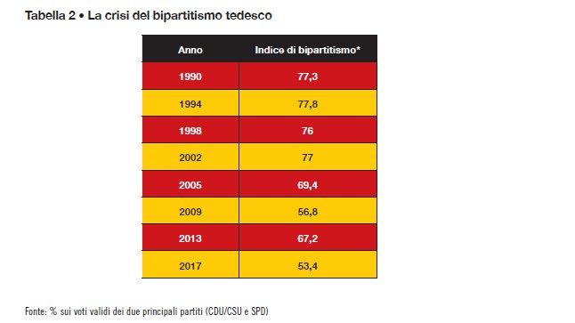 Persino in Germania, considerata per lungo tempo faro di stabilità politica in Europa, le elezioni federali del 2017 hanno consegnato un quadro frammentato, con i due principali partiti (cdu/csu e spd) entrambi ai minimi storici dalla riunificazione. Sommati, cristiano-democratici e socialdemocratici hanno raccolto poco più della metà dei voti, il 53,4%, in pesante flessione sul 67,2% del 2013 e in crollo verticale sul 76-78% che avevano raggiunto in tutte le elezioni fra il 1990 e il 2002.