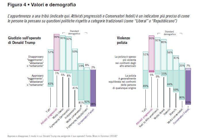 Il tribalismo politico di cui si parla oggi negli Stati Uniti non investe solo le opinioni sull’operato del presidente ma gli atteggiamenti nei riguardi dell’immigrazione, dell’economia, della condizione femminile, delle forze dell’ordine, addirittura dell’educazione dei bambini, come evidenzia lo studio Hidden Tribes promosso da More in Common.