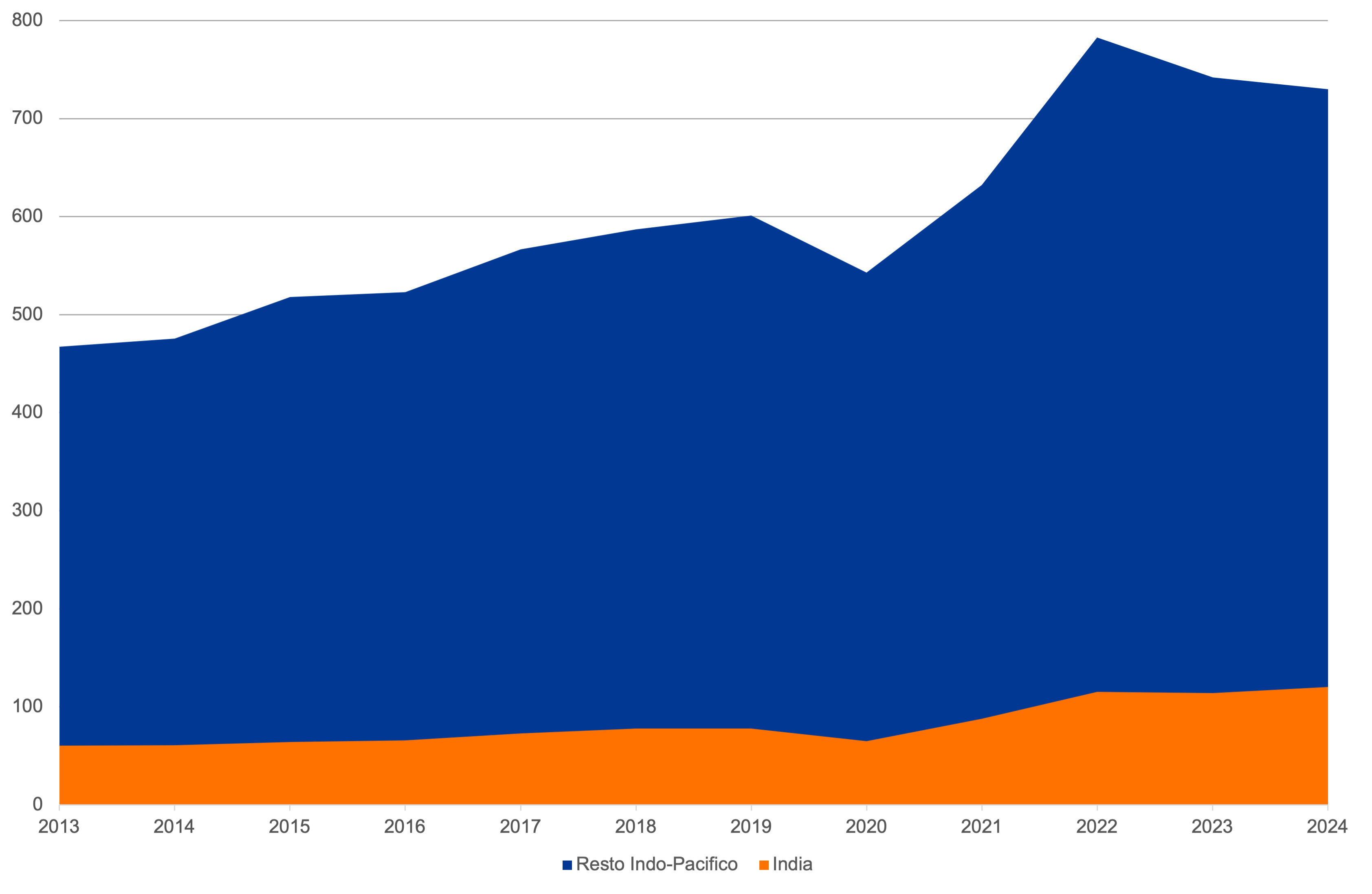 Si tratta di scambi commerciali dal valore economico sostanziale quando confrontati con gli scambi di altri grandi mercati. Per esempio, sempre nel 2024, l’Unione Europea ha scambiato con la Repubblica popolare cinese beni per un valore di 736 miliardi di euro. Tuttavia, queste cifre, quando rapportate ad altre dimensioni (ad esem- pio la popolazione e l’estensione geografica), diventano meno significative. Secondo l’ONU, l’Indo-Pacifico conta una popolazione di 3,9 miliardi di persone contro una popolazione cinese di 1,4 miliardi, mentre le superfici terrestri sono rispettivamente di circa 36 e 9,6 milioni di chilometri quadrati. In ogni caso, è il rapporto del volume degli scambi dell’Unione Europea con India e Cina – 1 a 6 – a risultare decisamente sproporzionato e, da una prospettiva opposta, dotato di un enorme potenziale di sviluppo.