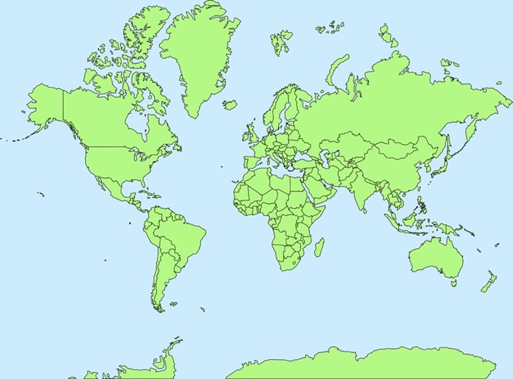 [1] Mercator is a conformal cylindrical map projection that was originally created to display accurate compass bearings for sea travel. An additional feature of this projection is that all local shapes are accurate and correctly defined at infinitesimal scale. Yet, size ratio not accurate. Territories farther away from the Equator look magnified. It was presented by Flemish cartographer Gerardus Mercator in 1569.