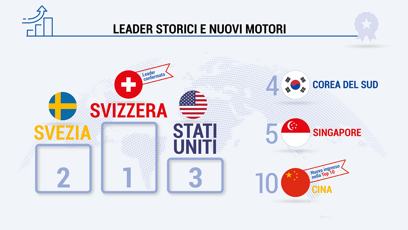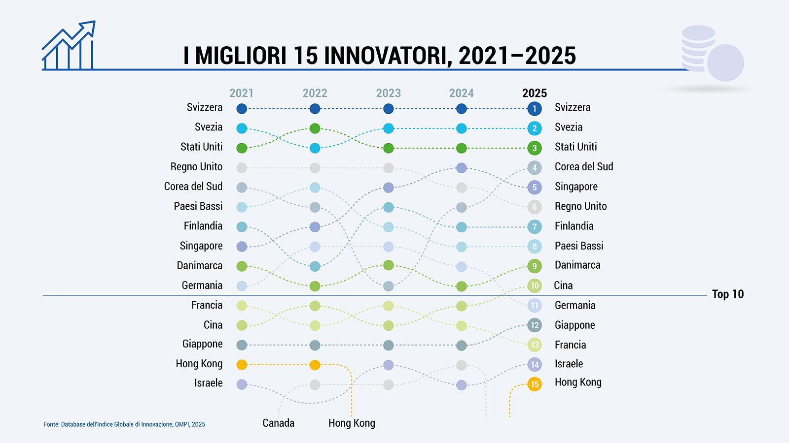 La classifica 2025 vede confermato al vertice il blocco dei leader storici, ovvero Svizzera (1ª), Svezia (2ª) e Stati Uniti (3ª), che restano ancora le tre economie più innovative del mondo, seguite dalla Corea del Sud (4ª) e da Singapore (5ª).