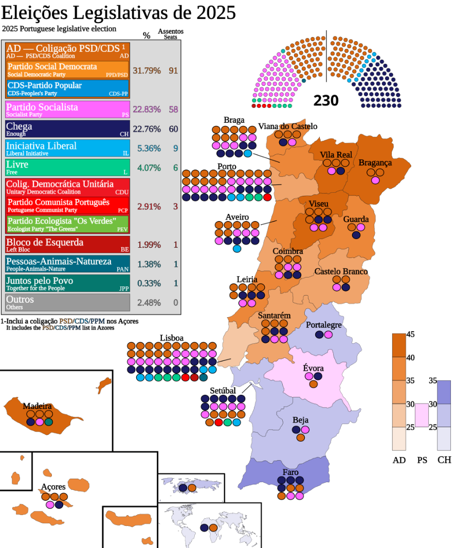 Quelle elezioni (marzo 2024) hanno riportato al governo il centrodestra, dopo otto anni all’opposizione, segnando la prima sconfitta del nuovo leader dei socialisti Pedro Nuno Santos, dirigente di lunga data ed ex ministro delle Infrastrutture e della Casa tra il 2019 e il 2023. Ma la rivincita di AD è stata nulla in confronto ai risultati del partito di estrema destra Chega, che si è imposto come terza forza con oltre un milione di voti e 48 deputati (nel 2022 erano 12), strappando l’intera regione dell’Algarve ai socialisti e alcuni distretti storicamente di sinistra come Setúbal, Portalegre e Beja ai comunisti.