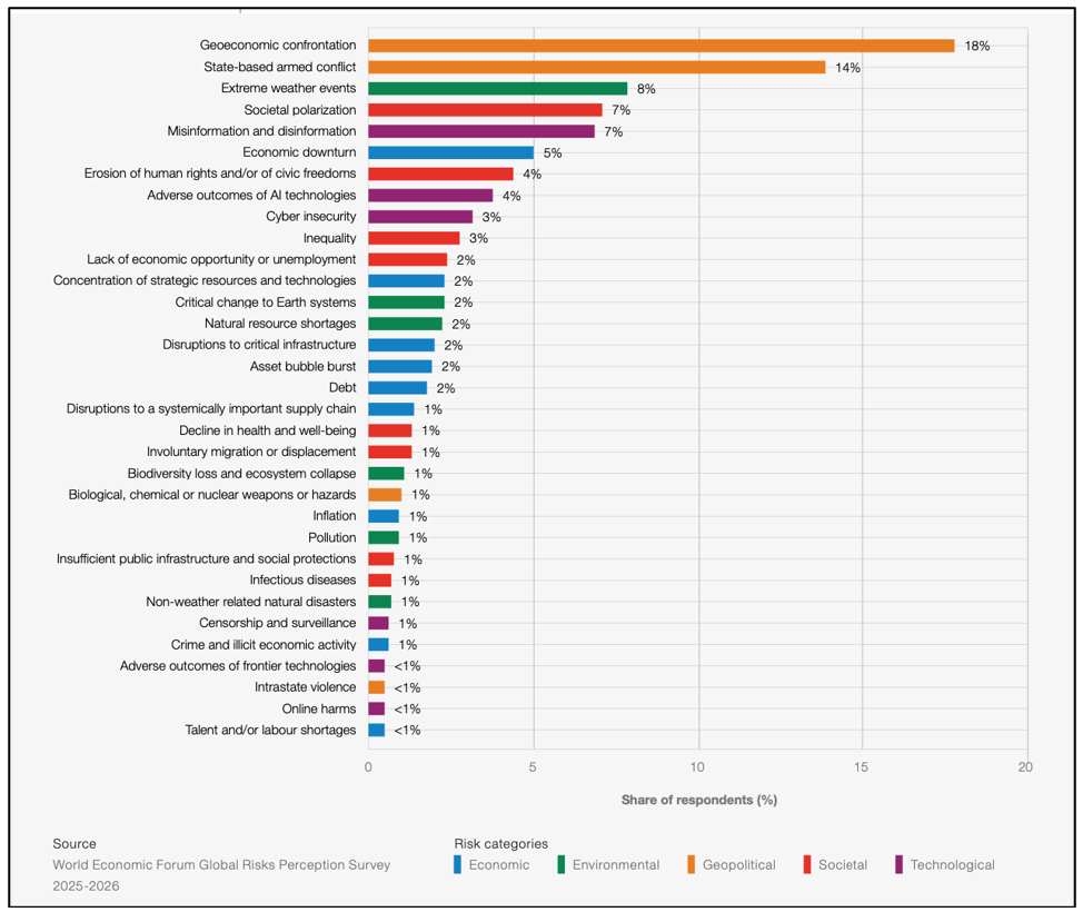 Fig. 1. Scenario attuale dei rischi globali, come stimato dal WEF Global Risk Report5. In ascissa è riportata la quota di rispondenti che hanno indicato la minaccia (in ordinata) nella propria lista di rischi futuri rilevanti per le entità critiche.