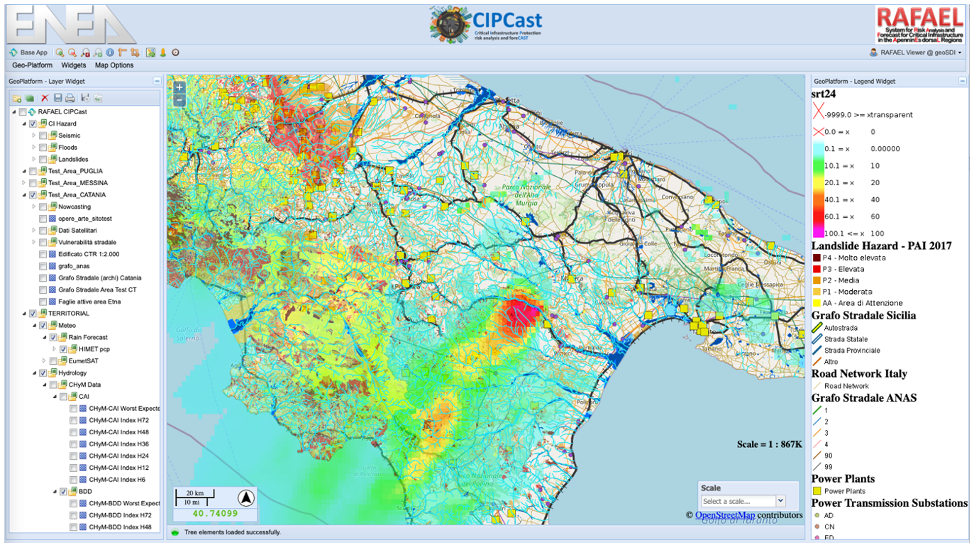 In Italia vi è stato uno sforzo rilevante, effettuato da ENEA negli ultimi 15 anni, che ha portato alla realizzazione di un complesso sistema di Supporto alle Decisioni (DSS, Decision Support System) in grado di: (a) realizzare il monitoraggio degli asset critici del Paese, (b) valutare l’impatto di eventi naturali estremi in grado di ridurre o interrompere la funzionalità operativa delle EC, (c) valutare anche potenziali effetti a cascata, (d) effettuare una stima dell’impatto sulla popolazione (sia in temini di ampiezza geografica della perturbazione, sia in termini della rilevanza delle EC potenzialmente più compromesse nella loro funzionalità. Il sistema di supporto, denominato CIPCast[9], espone i propri risultati tramite una interfaccia (in Fig.2 un esempio del sinottico del DSS), che consente la mappatura e rappresentazione di problematiche e di possibili impatti di eventi sulle specifiche Entità Critiche[10].