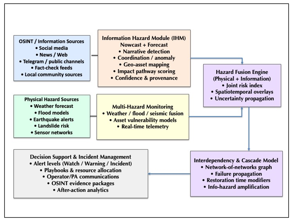 In un moderno sistema di monitoraggio, la protezione fisica e quella informativa devono essere integrate in un unico modello operativo. I pericoli fisici possono infatti innescare “pericoli informativi” a catena: ad esempio, gli effetti di un’alluvione possono essere esasperati da notizie false su presunti crolli di dighe o contaminazioni idriche, provocando congestioni stradali che ostacolano i soccorsi. Le infrastrutture di pubblica utilità (energia, acqua, ospedali) sono le più vulnerabili agli shock della domanda generati da tali rumors.