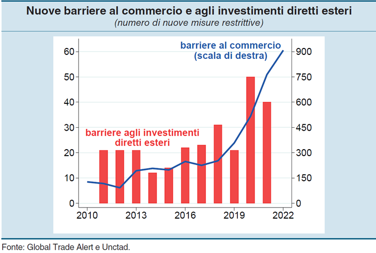 L’auspicio del Governatore contrasta tuttavia con una tendenza che si osserva chiaramente notando l’aumento significativo delle restrizioni al commercio che ha caratterizzato gli ultimi anni e che non sembra affatto sul punto di invertirsi. Al contrario: “Dall’invasione dell’Ucraina, le indagini presso le imprese, non solo italiane, mostrano che è in atto una tendenza, per ora moderata, alla regionalizzazione e alla diversificazione delle catene di fornitura”.