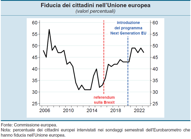 Disponiamo, tuttavia, di alcuni indizi, che lo stesso Visco sottolinea nella sua allocuzione. Eccone uno: “Le politiche europee mostrano che si può rinsaldare la fiducia nei benefici dell’integrazione economica internazionale. La fiducia dei cittadini nella costruzione europea, infatti, è in crescita anche in ragione della capacità di intervento mostrata dalle istituzioni europee in occasione della pandemia”.