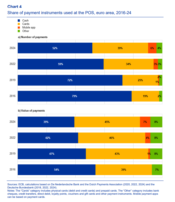 Fatte queste premesse, osserviamo rapidamente come si stiano evolvendo le modalità di pagamento nell’eurozona, prendendo come fonte il rapporto SPACE della BCE pubblicato nel dicembre 2024.