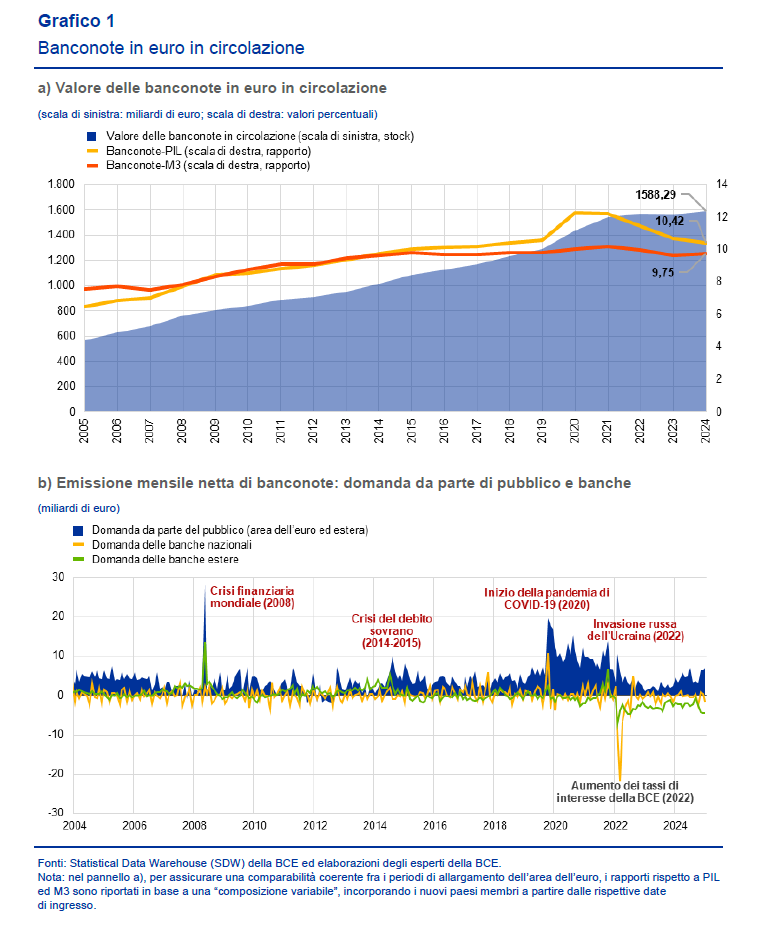 L’acronimo POS sta per Point Of Sale, ossia punti vendita. P2P sta per Person To Person. Come si può osservare il declino del numero dei pagamenti nei punti vendita è andato di pari passo con l’incremento dei pagamenti online, che sono triplicati fra il 2019 e il 2024. E questo è un primo indizio dell’importanza che avrà in futuro poter disporre di un euro digitale.