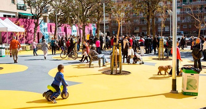 Esempi sono le spiagge urbane nelle grandi città lungo i fiumi, come a Parigi o a Roma, casi di street art con murales e colori in quartieri con aree urbane fatiscenti o pericolose che rafforzano l’identità locale, oppure ”esto no es un solar”, a Saragozza in Spagna, che significa “questo non è uno spazio vuoto”. Il progetto, attivo già dal 2009, prevede la destinazione d’uso temporanea a una trentina di aree urbane vuote, in cui associazioni, comitati di quartiere, semplici cittadini, artisti e collettivi, in un’ottica partecipata, danno vita a diverse iniziative: riqualificazione di giardini, orti urbani, spazi attrezzati per anziani, aree sport e gioco. Queste azioni mirano anche a lavorare su più fronti socio-culturali scolastici, come a Sassari dove una scuola secondaria di primo grado ha attivato un laboratorio di falegnameria per combattere la dispersione scolastica, Dispersione ZERO, e lo spazio anonimo di un marciapiede grigio è stato trasformato in un luogo per la sosta, il gioco, la lettura grazie alla realizzazione di panchine colorate e altri materiali.