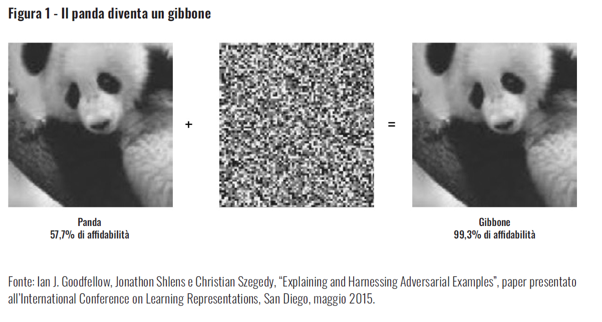 Bisogna poi considerare la vulnerabilità allo spoofing: in molti modelli IA è possibile modificare leggermente i dati in ingresso per portarli volutamente a conclusioni sbagliate. Per esempio, nella figura 1, l’aggiunta di un piccolo elemento di disturbo all’immagine del panda fa sì che questo venga classificato come un gibbone con una percentuale di affidabilità molto elevata. A questo si aggiunge la possibilità di generare contenuti audio e video altamente realistici ma del tutto inautentici (deepfake); tale capacità ha evidenti implicazioni per le prove presentate in tribunale e per certa ingannevole propaganda politica.