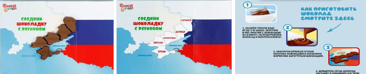 A famous Russian company commercialized chocolates in the shape of the new annexed territories, for children to play with, learn and eat. Young Russians are thus invited to literally “swallow” the new territories. The box contains a map of Russia, two packets of liquid chocolate, and molds shaped like the eastern regions of Ukraine (Crimea, Luhansk, Donetsk, Zaporizhzhia and Kherson). The family is supposed to pour the liquid chocolate into the molds, wait for it to cool down and then eat it. The box also includes the lyrics of the Russian national anthem, just in case the family wants to sing along while the chocolate cools. After all, there’s no such thing as too much patriotism when education is involved.