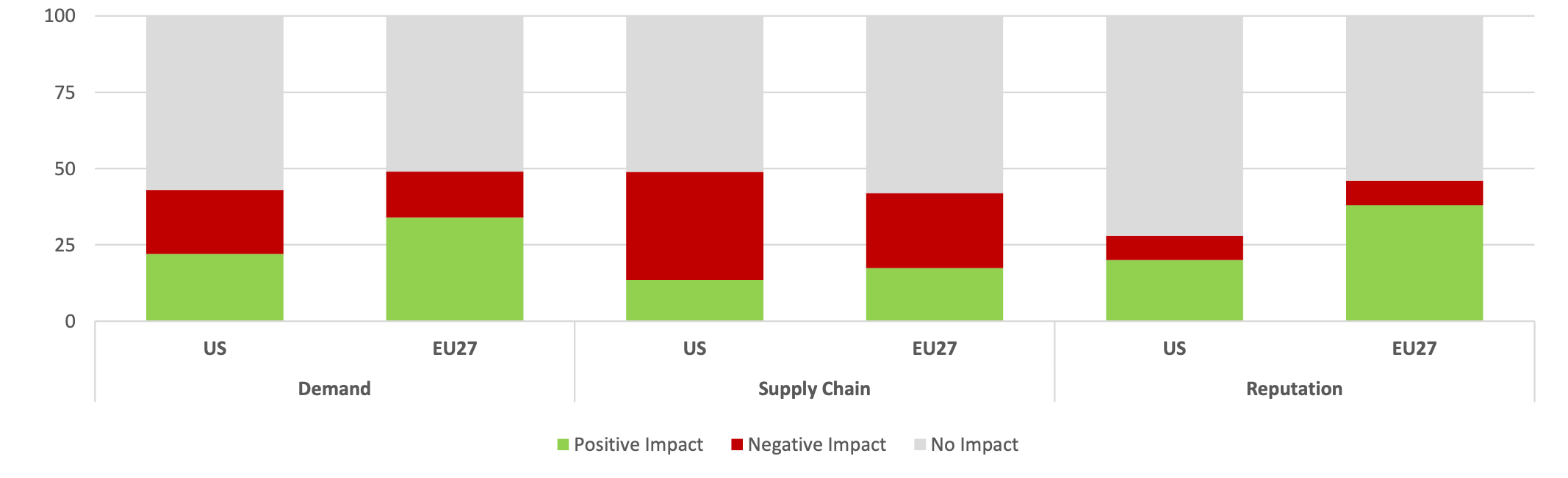 Alla domanda relativa all’effetto potenziale della decarbonizzazione sulla richiesta dei loro prodotti e servizi, o sulla loro reputazione, la maggior parte delle aziende, sia nell’UE che negli Stati Uniti, risponde che non avrà alcun impatto. Quando invece lo prevede, l’impatto stimato è per lo più positivo: la transizione climatica è vista anzitutto come un’opportunità.