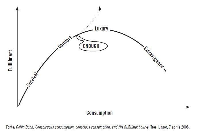 Il grafico mostra che cosa succede ad alti livelli di consumo, oltre i quali si varca la soglia tra benessere e ricchezza e si accede ai beni di lusso, ai capricci. Un consumatore responsabile può fermarsi al livello del benessere e sentirsi appagato.