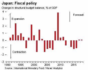 In Giappone, l’adozione della cosiddetta “Abenomics”, basata sulle tre frecce annunciate dal Primo Ministro Abe nella primavera del 2013 (espansione della base monetaria e quantitative easing, avvio di massicci investimenti pubblici, riforme strutturali) ha incontrato difficoltà di applicazione: il debito pubblico molto elevato non consente una politica di bilancio decisamente espansiva, che anzi ha agito da freno nel 2014 e lo farà ancora per almeno un paio di anni (grafico 3). Inoltre, le resistenze interne hanno finora bloccato le riforme strutturali promesse da Abe.
