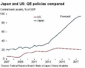 Realmente efficace è stata finora solo la politica monetaria espansiva (con QE di dimensione doppia di quella USA e attesa in ulteriore forte espansione, grafico 4) nel far salire le aspettative di inflazione fino al 2% e nel determinare una decisa svalutazione dello Yen. Nonostante la politica monetaria aggressiva, il tasso di crescita del PIL del Giappone nei prossimi cinque anni è atteso spostarsi appena al di sopra dei livelli dell’ultimo decennio.