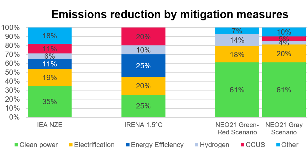Fig. – 4 Emissions reduction by mitigation measures, source: elaborations on IEA website, IRENA World Energy Transitions Outlook: 1.5°C Pathway, BloombergNEF New Energy Outlook 2021 Executive Summary and website