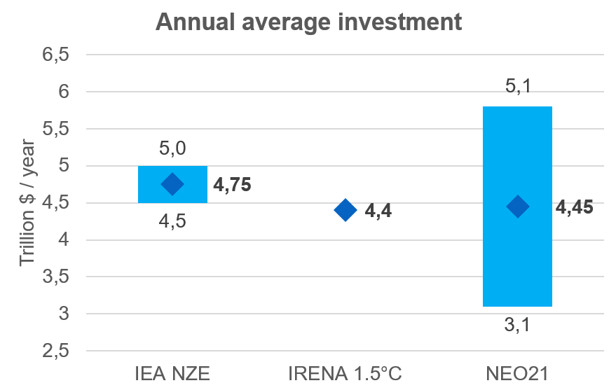 Fig. 7 – Annual average investment until 2050 for net zero emissions, source: elaborations on IEA Net Zero by 2050, IRENA World Energy Transitions Outlook: 1.5°C Pathway, BloombergNEF New Energy Outlook 2021 Executive Summary