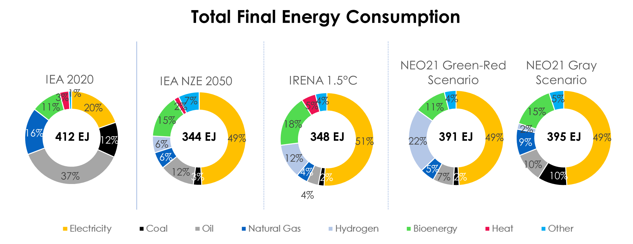 Fig. 5 – Total Final Energy Consumption for 2020 and 2050, source: elaborations on IEA Net Zero by 2050, IRENA World Energy Transitions Outlook: 1.5°C Pathway, BloombergNEF New Energy Outlook 2021 Executive Summary