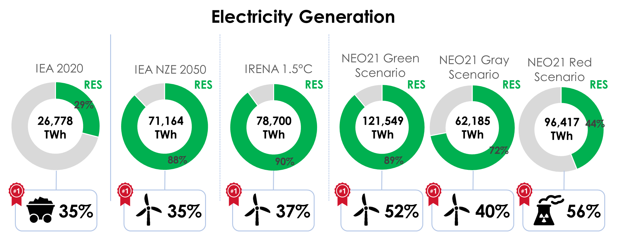 Fig. 6 – Electricity Generation, RES share and first source of generation for 2020 and 2050, source: elaborations on IEA Net Zero by 2050, IRENA World Energy Transitions Outlook: 1.5°C Pathway, BloombergNEF New Energy Outlook 2021 Executive Summary