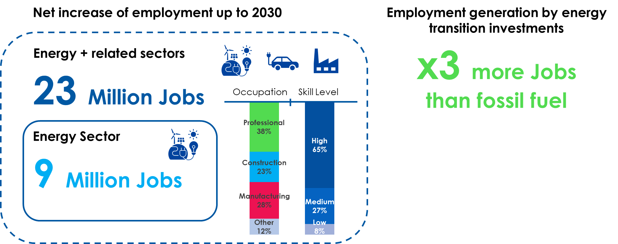 According to IEA, the energy sector alone could by 2030 produce a net increase of nine million jobs, reaching the 23 million mark by also considering the related sectors such as e-mobility, building and industry efficiency. Such jobs will be covered mainly by professional figures, followed by manufacturing and construction experts; over 50% of the jobs would require high skill levels. Investing in clean technologies is a win-win situation. IRENA estimates that for each million dollars spent in energy transition technologies up to three times more jobs are created than fossil fuels; however, it is necessary to quickly start implementing roadmaps and investments to reap all the benefits of decarbonization.